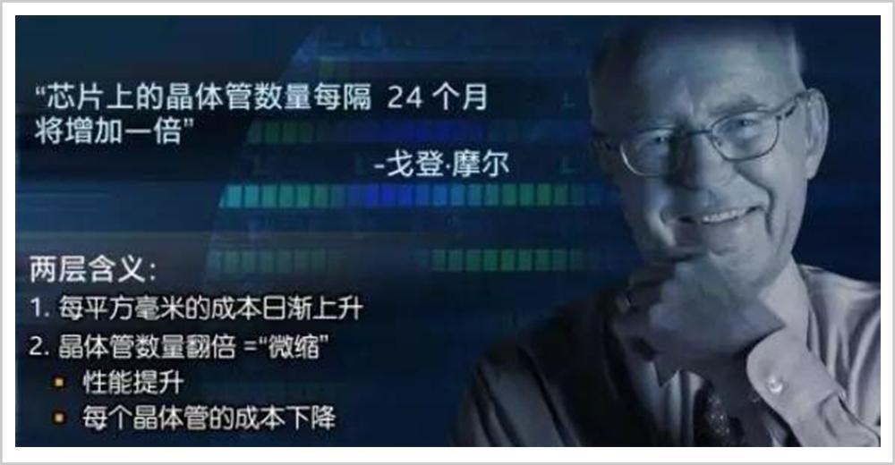 当价格不变时,集成电路上可容纳的晶体管的数目,大概每隔24个月便会增加一倍,性能也将提升一倍。