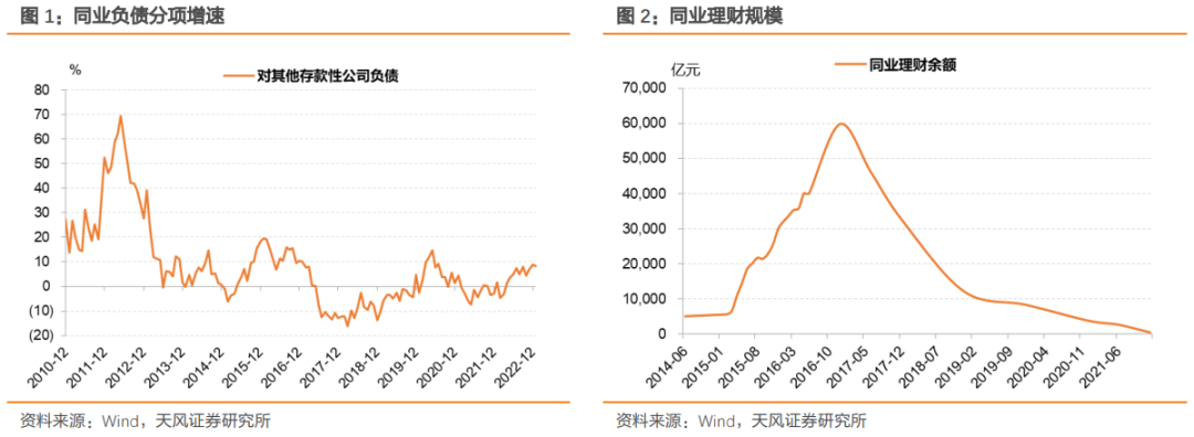 从银行资产负债表角度出发,利用对其他存款类公司负债的同比增速和同业理财两个指标来观察同业行为: