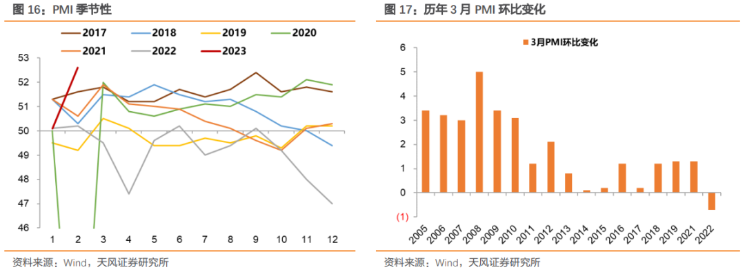 历年来3月PMI绝大多数相比2月读数上行,如果按照目前情况估计,今年3月PMI或存在反季节性走低,这很大程度上缘于2月给出了一个特别高的前提。