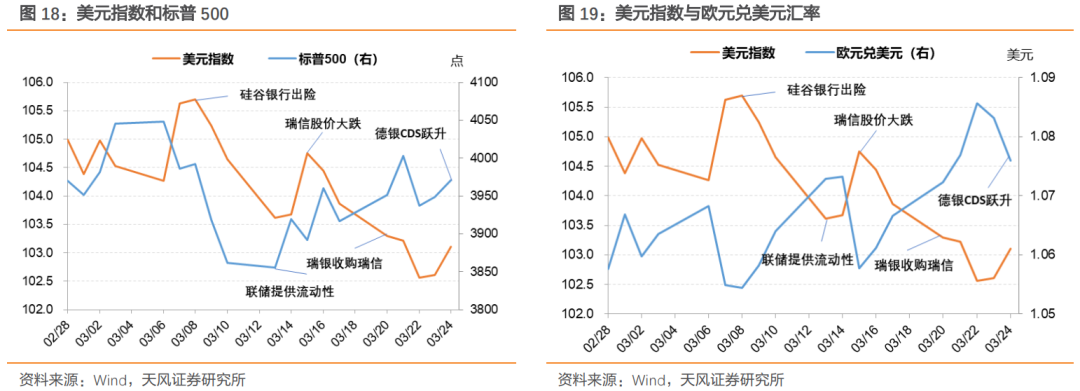 观察美元指数表现,3月8日以来走势的关键在于欧美金融体系的风险事件。硅谷银行出险后欧元对美元走强、美元走弱,瑞信披露财报问题以及德银CDS报价跃升后欧元对美元走弱、美元走强。总体美元指数在海外事件中有所走弱。