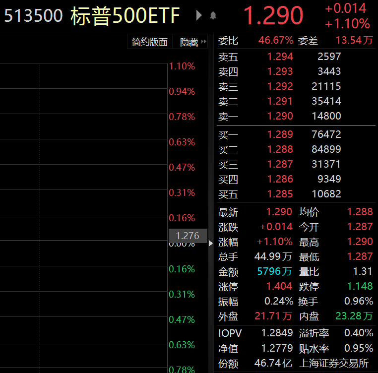 ETF方面,受24日标普500指数上涨影响,今日(3月27日)标普500ETF(513500)上涨,截至发稿,该ETF涨超1%,成交额接近5800万元,换手率0.96%,盘中溢价交易,溢折率为0.40%。