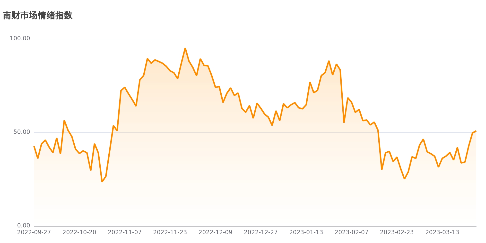 今日南财市场情绪指数为50.9,较前一交易日49.7上涨,市场投资热度提升。
