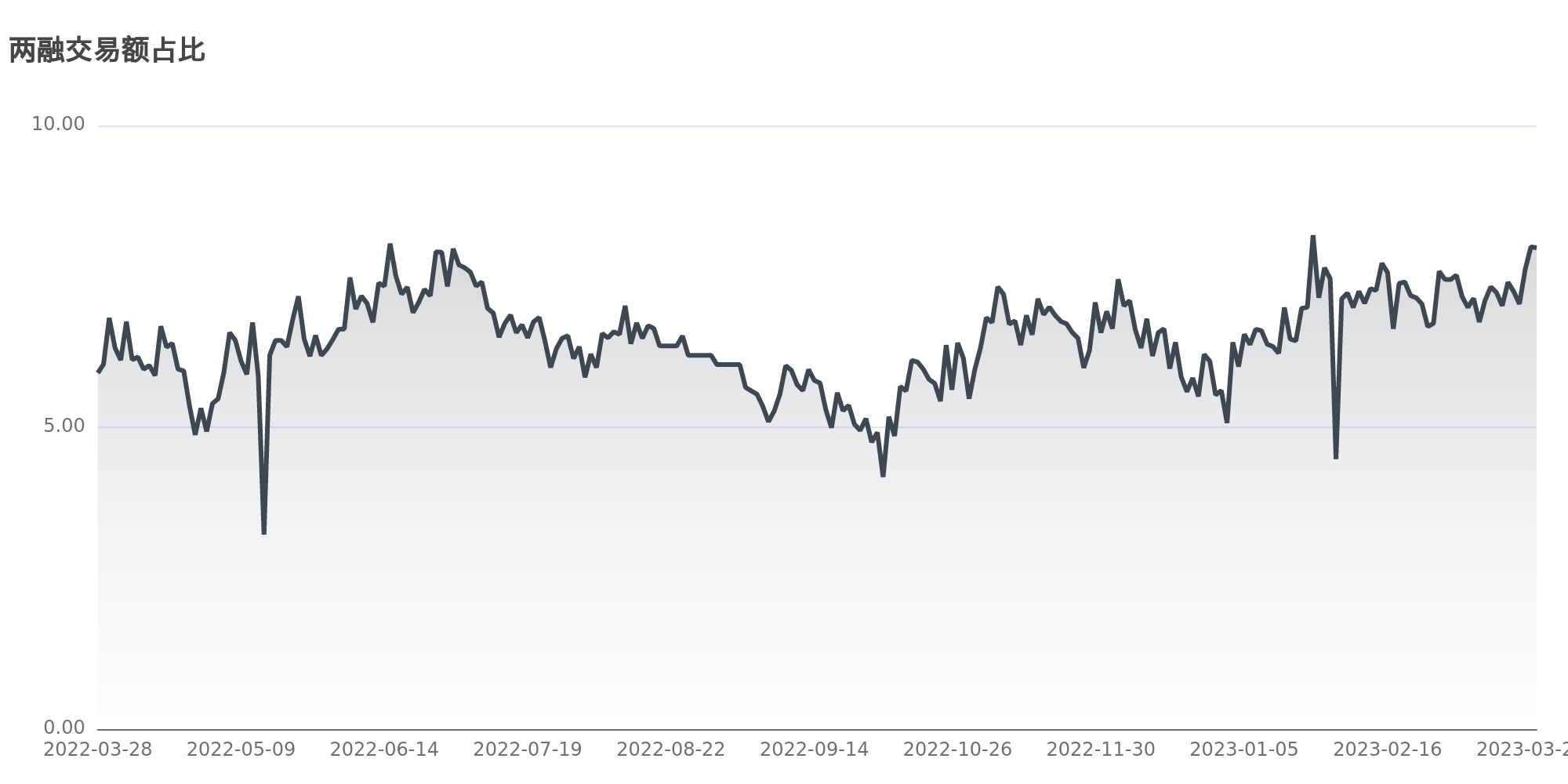 今日该指标值为7.97%,目前该指标处于近一年较高区间,认为当前A股市场相对较强。反映场内投资者借钱炒股的杠杆水平,该指标越高说明杠杆水平越高,即投资者认为当前市场较强,反之则说明投资者认为市场相对较弱,因而与上证指数存在较强的正相关性。