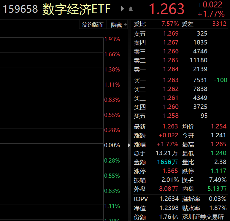 受重仓股广联达、恒生电子以及成份股同花顺、石基信息影响,数字经济ETF(159658)盘中异动拉升,截至发稿,该ETF涨1.77%,成交额破1600万元,换手率7.49%。