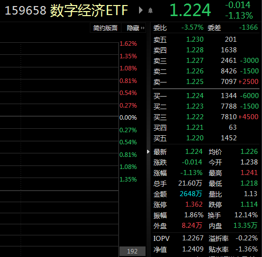 数字经济ETF(159658)出现回调,截至发稿,该ETF成交额2648万元,换手率为12.14%,交投活跃。