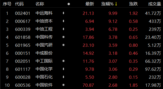 中字头板块再度反弹回升,中远海科涨停,中油资本涨超9%逼近涨停,中油工程涨近7%,中国科传、中国汽研、中成股份等多股跟涨。