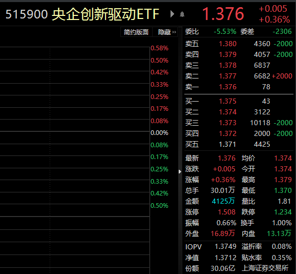 相关ETF方面,截至发稿,央企创新驱动ETF(515900)涨0.36%,成交额超4100万,交投活跃。截至3月27日,今年来央企创新驱动ETF(515900)涨超16%。该ETF跟踪的中证央企创新驱动指数,前三大权重行业分别为建筑装饰、计算机和电力设备,成份股股息率超3.5%,估值水平处于历史相对低点,长期配置价值显著。