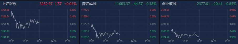 南财金融终端显示,截至上午收盘,上证指数涨0.05%,深证成指跌0.38%,创业板指跌0.85%。