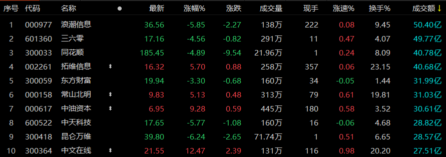 沪深两市今日半天成交额6049亿,较上个交易日同期缩量1626亿。截至午间收盘,浪潮信息成交额排名第一,达50.40亿元;三六零、同花顺、拓维信息成交额也在40亿元以上,分别为49.77、40.78、40.68亿元。
