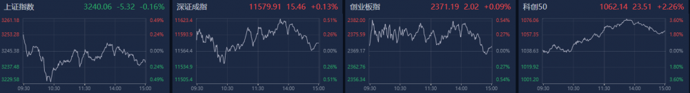 南财金融终端显示,截至收盘,上证指数跌0.16%,报收3240.06点;深证成指涨0.13%,报收11579.91点;创业板指涨0.09%,报收2371.19点;科创50指数涨2.26%,报收1062.14点。