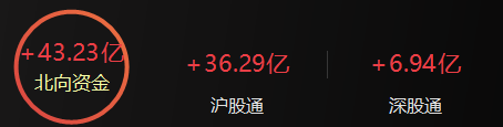 北向资金全天净买入43.23亿元,其中沪股通净买入36.29亿元,深股通净买入6.94亿元。