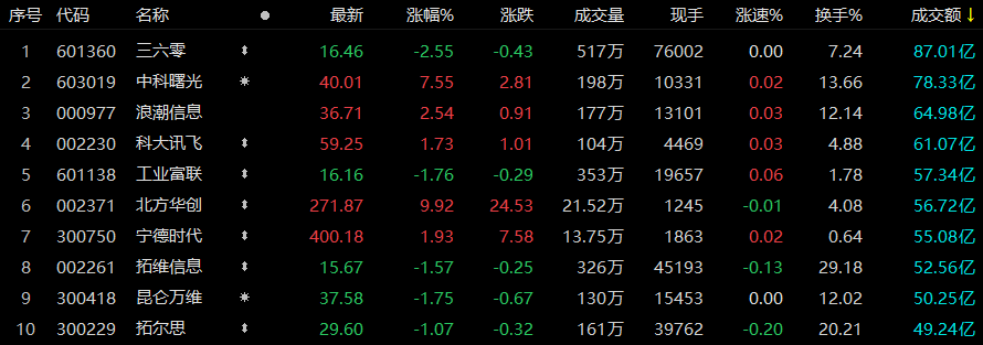 个股方面,三六零成交额居首,达87.01亿元。中科曙光、浪潮信息、科大讯飞成交额也在60亿元以上,分别为78.33、64.98、61.07亿元。