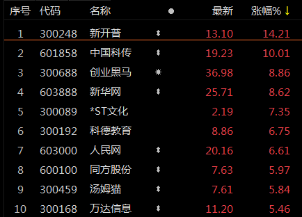 今日,在线教育板块活跃,截至发稿,新开普涨超14%,中国科传涨停,创业黑马、新华网涨超8%,*ST文化、科德教育、人民网、同方股份、汤姆猫、万达信息等跟涨。