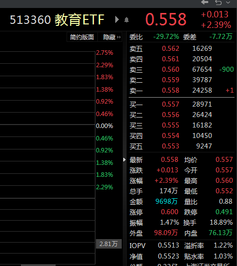 截至发稿,教育ETF(513360)涨2.39%,盘中交易溢价,溢价率达1.22%,成交额接近1亿元。该ETF其他成分股表现多为强势,好未来涨超8%,新东方涨近5%,宇华教育涨超4%,传智教育、东方甄选、科大讯飞跟涨。