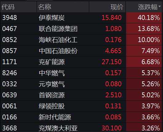 或受“三桶油”业绩、高分红影响,港股能源行业领涨,伊泰煤炭涨超40%,联合能源集团涨超13%,海峡石油化工涨10%,中国石油股份、兖矿能源、中华燃气、元亨燃气、首钢资源、绿领控股、新时代能源、兖煤澳大利亚跟涨。