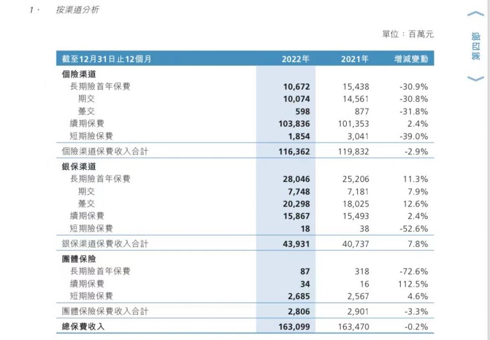 个人寿险业务方面,个险渠道实现保费收入1163.62亿元,同比下降2.9%,其中长期险首年保费106.72亿元,同比下降30.9%;续期保费1038.36亿元,同比增长2.4%。