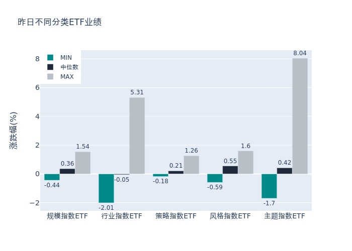 3月31日股票型ETF收益率中位数为0.31%。其中按照不同分类,规模指数中创科技ETF收益率最高,为1.54%;行业指数中国泰中证全指软件ETF收益率最高,为5.31%;策略指数中华夏创业板低波价值ETF收益率最高,为1.26%;风格指数中国寿安保创精选88ETF收益率最高,为1.6%;主题指数中华夏中证动漫游戏ETF收益率最高,为8.04%。