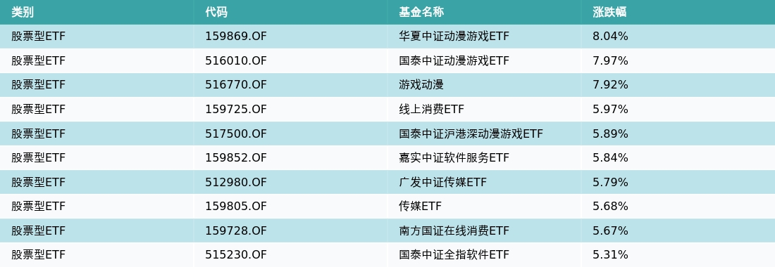 3月31日股票型ETF涨幅最高的3支ETF及其收益率分别为:华夏中证动漫游戏ETF(8.04%)、国泰中证动漫游戏ETF(7.97%)、游戏动漫(7.92%)。涨幅前10详情见下表: