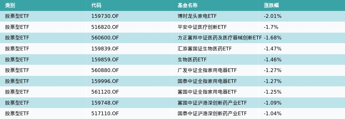 3月31日股票型ETF跌幅最大的3支ETF及其收益率分别为:博时龙头家电ETF(-2.01%)、平安中证医疗创新ETF(-1.7%)、方正富邦中证医药及医疗器械创新ETF(-1.68%)。跌幅前10详情见下表: