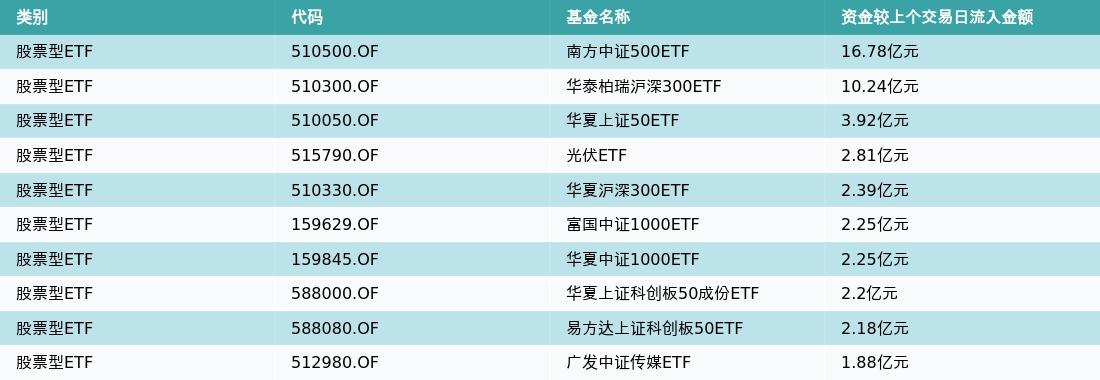 3月31日股票型ETF资金流入最多的3支ETF及其流入金额分别为:南方中证500ETF(流入16.78亿元)、华泰柏瑞沪深300ETF(流入10.24亿元)、华夏上证50ETF(流入3.92亿元)。资金流入前10详情见下表: