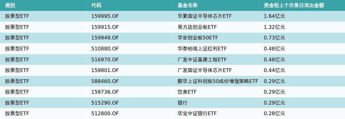 3月31日股票型ETF资金流出最多的3支ETF及其流入金额分别为:华夏国证半导体芯片ETF(流出1.64亿元)、易方达创业板ETF(流出1.32亿元)、华安创业板50ETF(流出0.73亿元)。资金流出前10详情见下表: