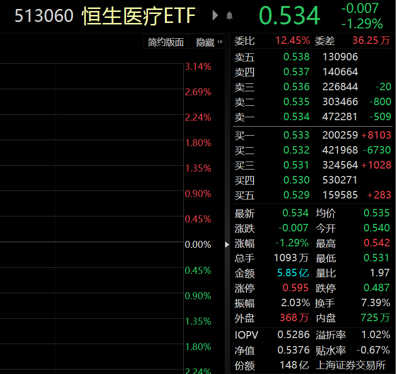 跟踪该指数的恒生医疗ETF(513060)跌1.29%,盘中溢价明显,溢折率为1.02%,多头意愿强烈。换手率为7.39%,成交额为5.85亿元,交投活跃。