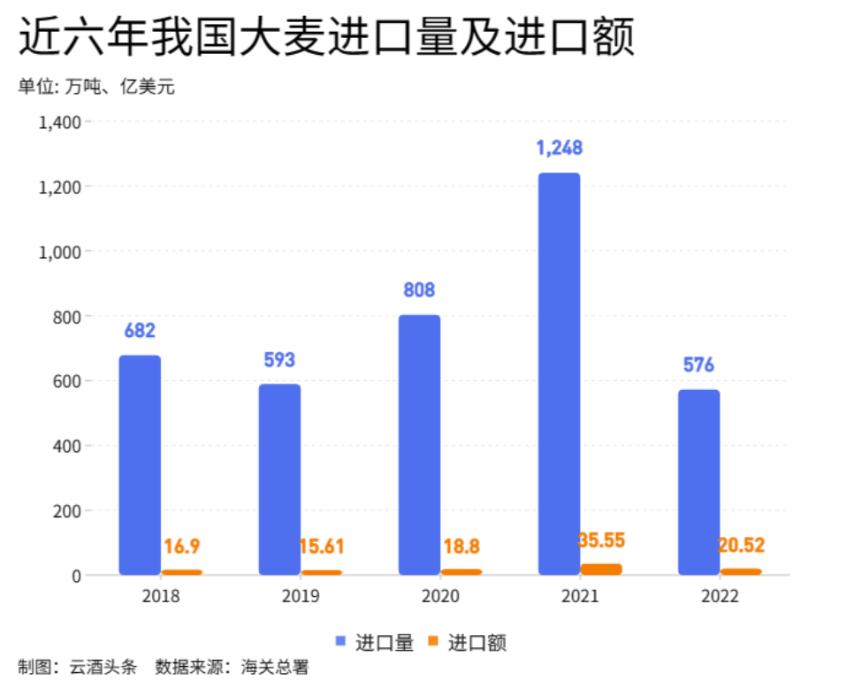 大麦作为啤酒重要的上游产业,其价格的起伏与终端市场息息相关。尽管2022年我国进口大麦量额双降,深度依赖于进口大麦的啤酒行业仍取得了不错的成绩。