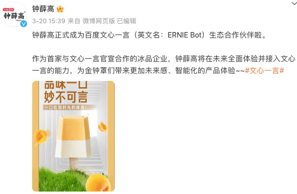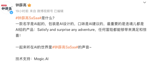 此前的3月20日,钟薛高曾官宣与百度文心一言合作,可以推测,此次Sa\'Saa的AI设计开发可能使用了文心一言、ChatGPT等主流AI产品。