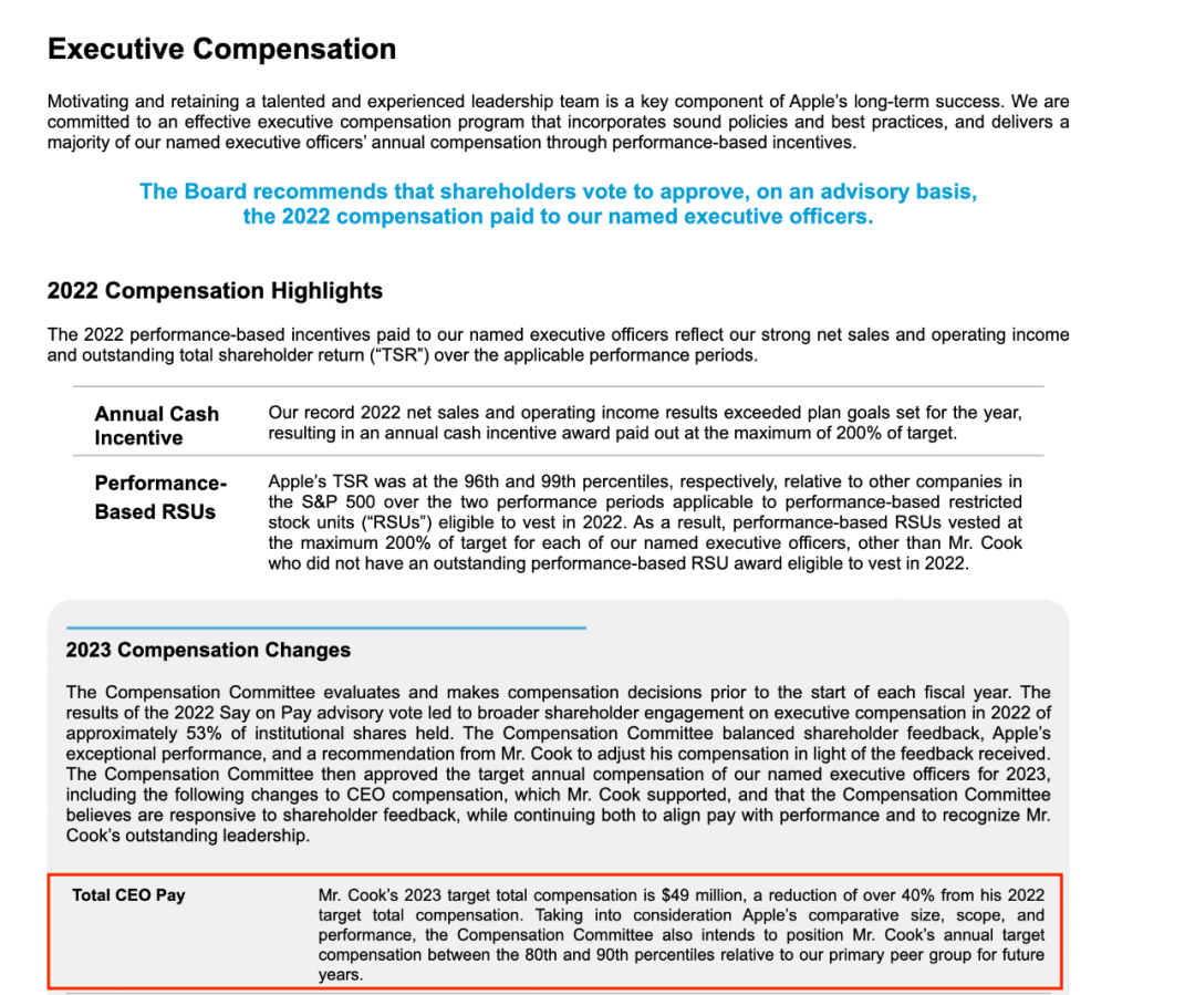 2023年库克薪酬变动,图源苹果公司提交给美国证券交易委员会的文件