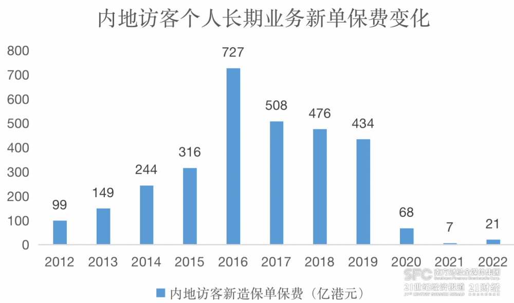 香港保监局公布的数据显示,2020年,内地访客新造保单保费降至68亿港元,较2019年的434亿港元下跌84.3%,仅占个人业务总额的5.1%,到了2021年更是跌至6.88亿港元,2022年略微回升至21亿港元。