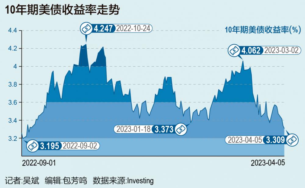 4月5日,有着“全球资产定价之锚”之称的10年期美债收益率再度下挫,一度跌至3.27%下方,创下2022年9月7日以来最低。