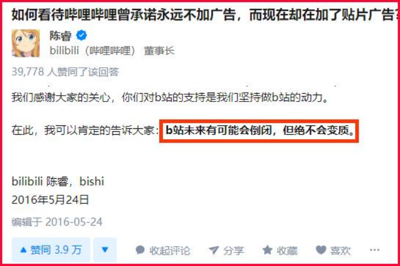 2014年,B站创始人徐逸公开对所有B站用户许下了一个承诺:bilibili的正版新番永远不添加贴片广告,不加贴片广告的承诺就此成了B站的祖训。这让播放量激励的性质从YouTube的广告分成变成了平台烧钱补贴。