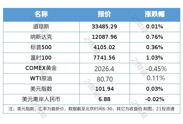 美股三大股指6日集体收涨。截至收盘,道指报33485.29点,涨0.01%;纳指报12087.96点,涨0.76%;标普500指数报4105.02点,涨0.36%。