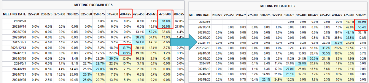 PCE公布以后,加息预期保持基本不变,市场基本上是押注5月份暂停加息的。但是周末OPEC+联合减产原油带动加息预期再度上行25个BP,也就是5月还要加息。到年底利率4.25-4.5%,依旧维持75个BP的降息幅度。