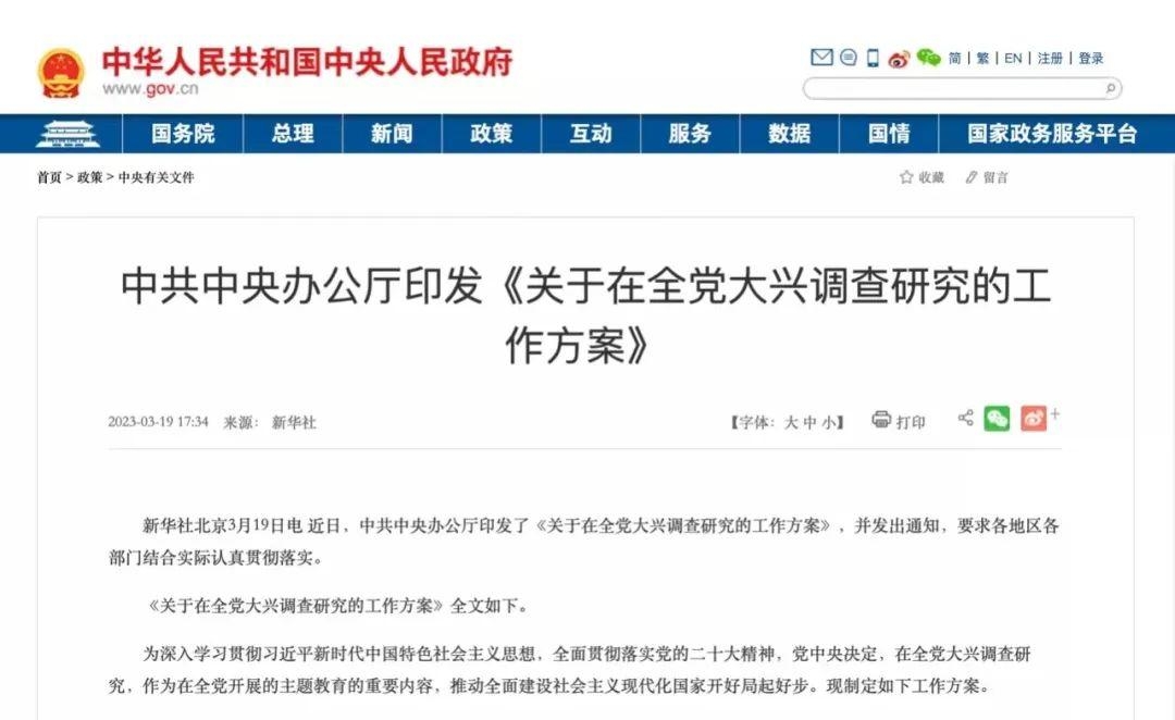 近日,中办印发《关于在全党大兴调查研究的工作方案》。(图源:中国政府网)
