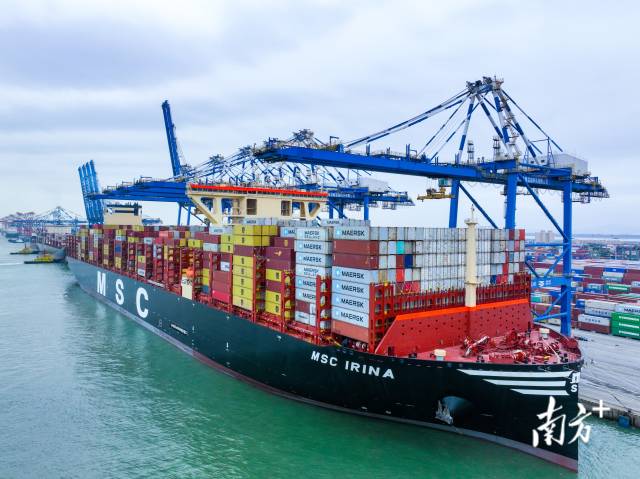 我国自主研制的全球最大集装箱船“地中海伊琳娜”号缓缓靠泊广州港南沙二期集装箱码头。黎其骏 摄