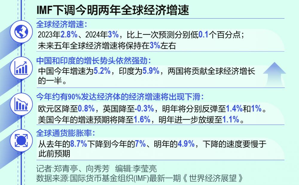 根据该机构的预测,今明两年,全球经济增速将分别达到2.8%、3%,这比该机构三个月前的预测分别低0.1个百分点;全球通货膨胀率将从去年的8.7%下降到今年的7%、明年的4.9%,下降的速度要慢于此前预期。