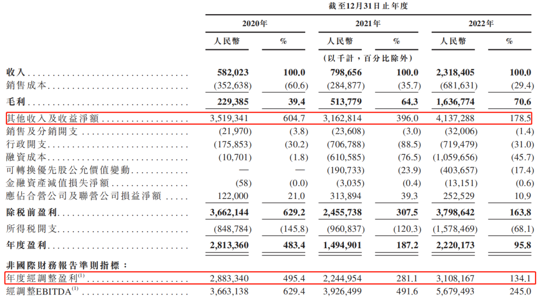 长期以来,京东产发的“其他收入及收益净额”均明显高于营业收入,致使京东产发在报告期内,净利润持续高于营业收入。2020年-2022年,京东产发经调整利润分别为28.83亿元、22.45亿元、31.08亿元。