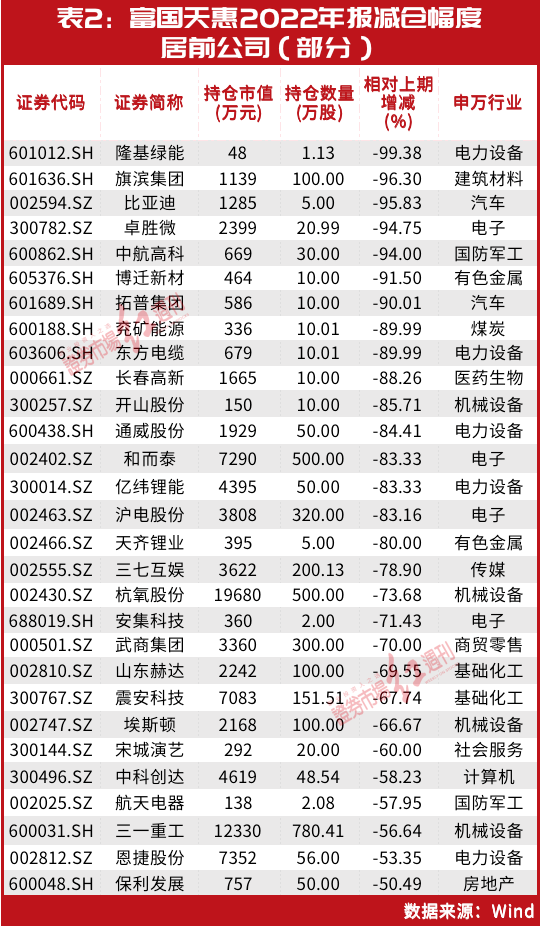 仔细观察不难发现,光伏、锂电池等新能源是被减仓最明显的领域之一。具体来看,年报数据显示,富国天惠减仓光伏公司隆基绿能、通威股份等幅度均超过80%,减仓锂电池企业亿纬锂能、天齐锂业等幅度同样也都超过了80%。截至去年末,富国天惠持仓隆基绿能1.13万股,相对上期减仓幅度达99.38%,持仓市值仅为48万元,几乎是在清仓离场(见表2)。