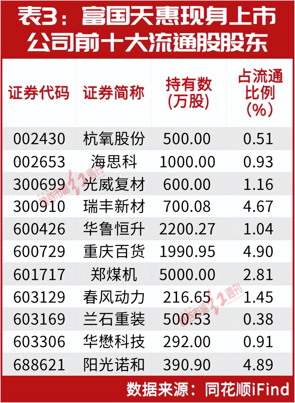 目前来看,富国天惠出现在杭氧股份、光威复材、瑞丰新材、兰石重装等10余家公司前十大流通股股东中(见表3)。