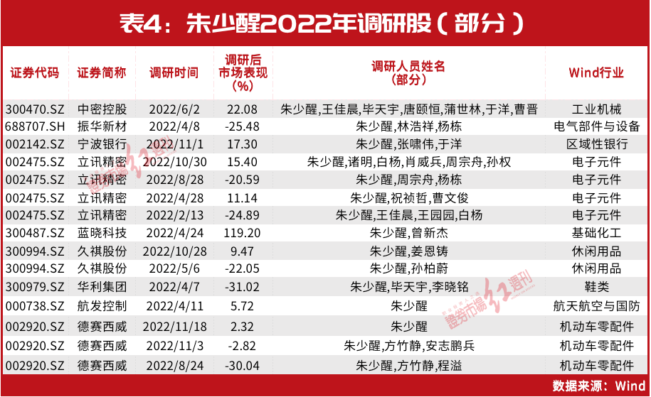 2022年全年,朱少醒参与调研较为活跃,据不完全统计,其去年曾现身于德赛西威、宁波银行、立讯精密、久祺股份、中密控股等近10家公司的调研名单中。对部分个股更是进行了多次调研,如电子元件公司立讯精密,朱少醒分别于2022年2月、4月、8月与10月对其进行了4次调研,另外,对汽车零部件公司德赛西威进行了3次调研,对自行车企业久祺股份进行了2次调研(见表4)。
