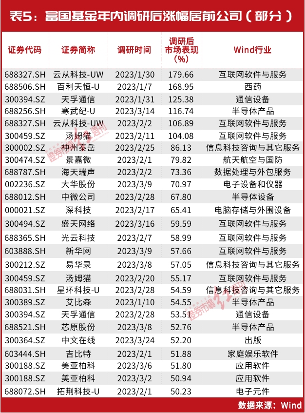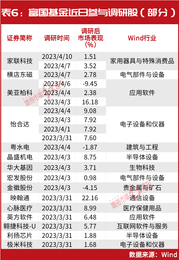 “踩点精准”的富国基金,近日还参与调研了家联科技、美亚柏科、华大基因等家居用品、应用软件、生物科技等领域的相关企业(见表6),如果向后市去看,相关公司是否也有望迎来不错的表现?
