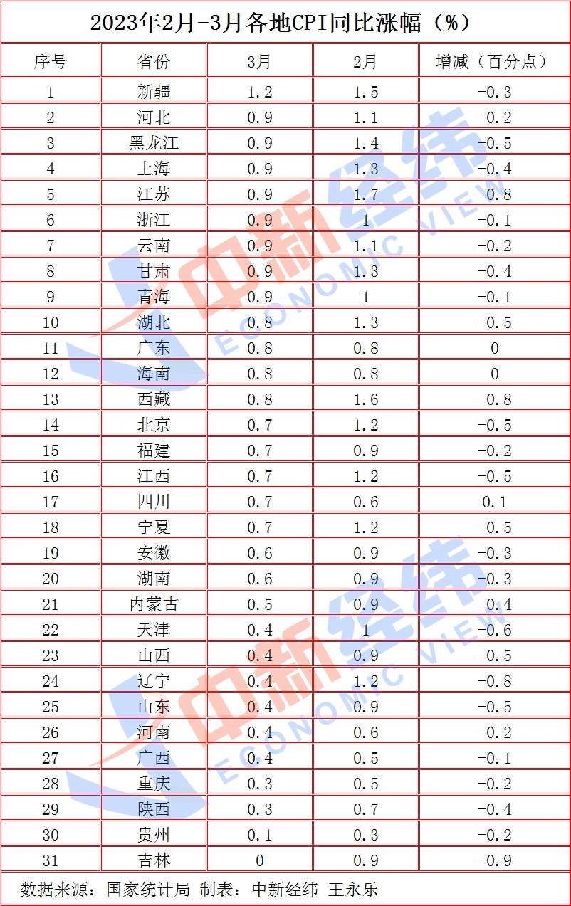日前,国家统计局公布了31省份2023年3月居民消费价格指数(CPI)。中新经纬梳理发现,3月,31省份CPI同比涨幅仅有四川高于上月。其中,新疆最高为涨1.2%,吉林最低为持平。