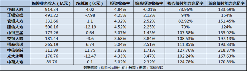去年,10家银行系险企2022年综合投资收益率均未超过4%,交银人寿综合投资收益率最高,为3.84%,中邮人寿综合投资收益率最低,为-0.01%。