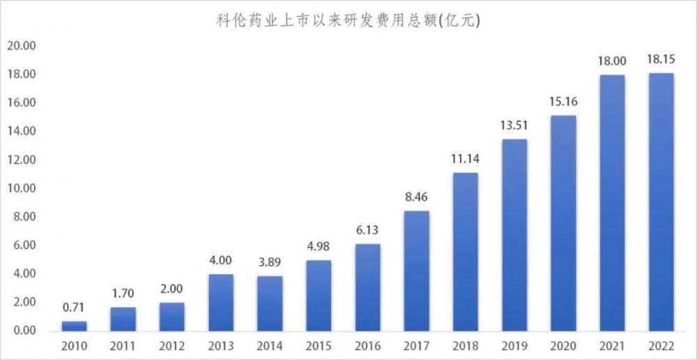 从2010年上市开始,科伦药业几乎是持续不断地增加自身的研发投入。2010年科伦的研发投入为0.71亿元,占营业收入的比重为2.87%,还不到3%。至2022年,科伦药品的研发投入达到18.15亿元,占营业收入的比重达到9.6%,研发人员人员数量占比达到13.86%。