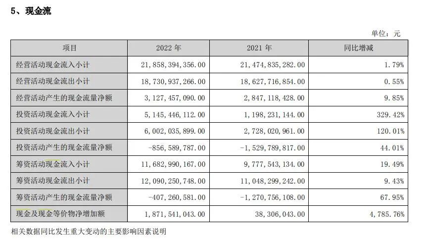 2020与2021两年,尽管增加金额不大,但仍是呈现正向增长趋势,而2022年现金流状况相比之前可以用爆发来形容。
