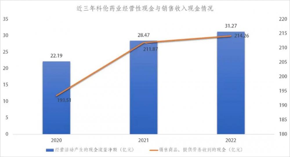 近三年,科伦药业经营业现金流稳健增长,2022年再度达到新高。2020—2022年,科伦药业经营性现金流净额分别为22.19亿元、28.47亿元、31.27亿元,2022年较上年同期增长9.85%。同时,销售商品、提供劳务收到的现金与经营性现金流的同向正增长,产品销售强劲。2022年收现比为1.13,净现比为1.83,收现比与净现比大于1,反映出科伦药业资金充裕、利润含金量高。