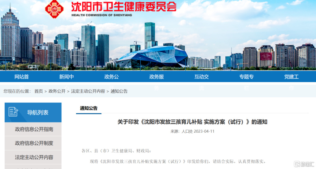 4月11日,沈阳市卫生健康委员会、沈阳市财政局联合印发《沈阳市发放三孩育儿补贴实施方案(试行)》,明确三孩育儿补贴的具体发放条件和补贴标准,以推动三孩育儿补贴政策切实落实落地。