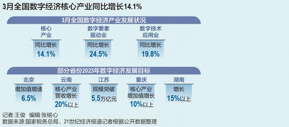 数字经济无疑是一季度的关键词,不少机构分析其或成为2023年一整年的主线。数据似乎也在证明这一趋势:4月6日,国家税务总局局长王军在“权威部门话开局”系列主题新闻发布会上介绍称,3月份数字经济核心产业同比增长14.1%,较去年全年加快7.3个百分点。其中数字要素驱动业、数字技术应用业增长更快,同比分别增长24.5%和19.8%。