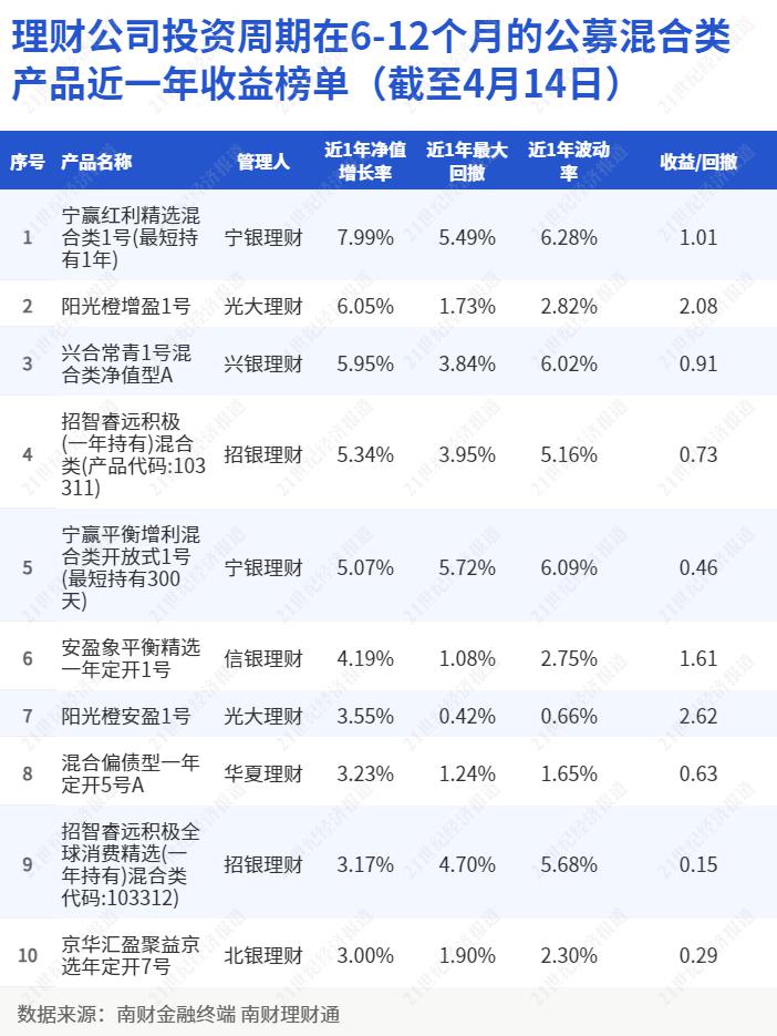 南财理财通数据显示,截至4月14日,在理财公司投资周期为6-12个月(含)的公募混合类产品近一年收益排行榜中,共有7家理财公司产品跻身前十。其中,宁银理财、光大理财和招银理财各有2只产品上榜,兴银理财、信银理财、华夏理财和北银理财各有1只产品上榜。